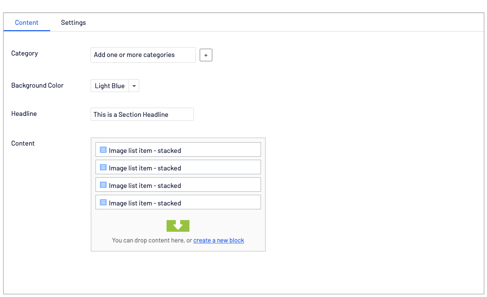 To add blocks into the container, you can just simply drag any blocks into the content area. At the container level, you will have the ability to include section headline, background color, and control hiding the top and bottom padding.